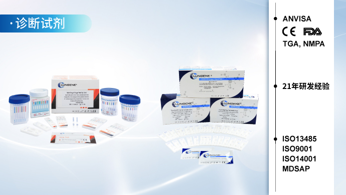 历经多年的创新发展,隆基生物搭建了胶体金/乳胶免疫层析、荧光免疫、化学发光和分子诊断的技术平台,隆基生物开发的诊断试剂产品覆盖了传染病类、毒品类、炎症类、心肌标志物类、肿瘤标志物类、宠物类等各大领域,主营的POCT即时诊断试剂获得了中国NMPA、美国FDA、欧盟CE和巴西ANVISA的上市许可,畅销全球100多个国家和地区。